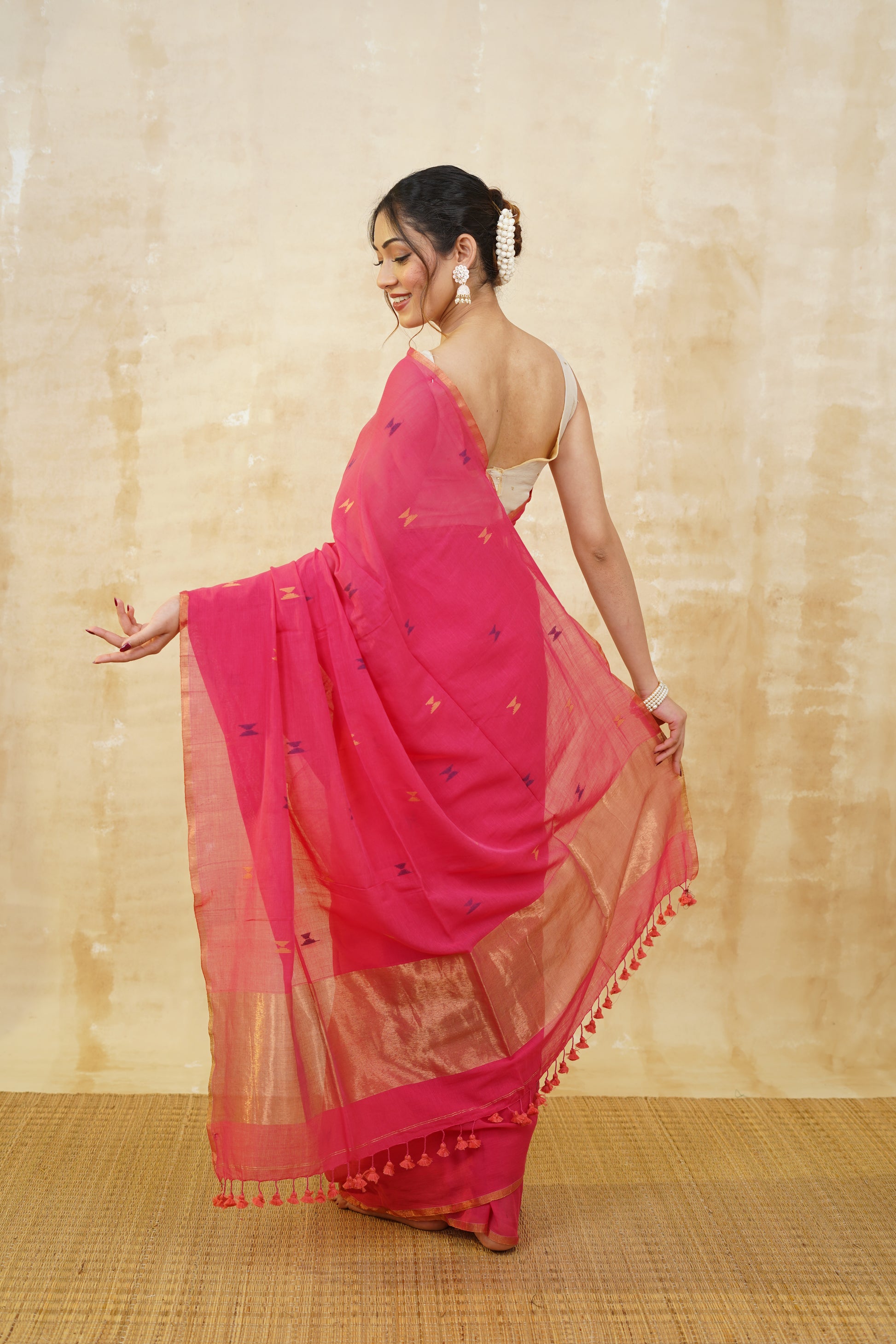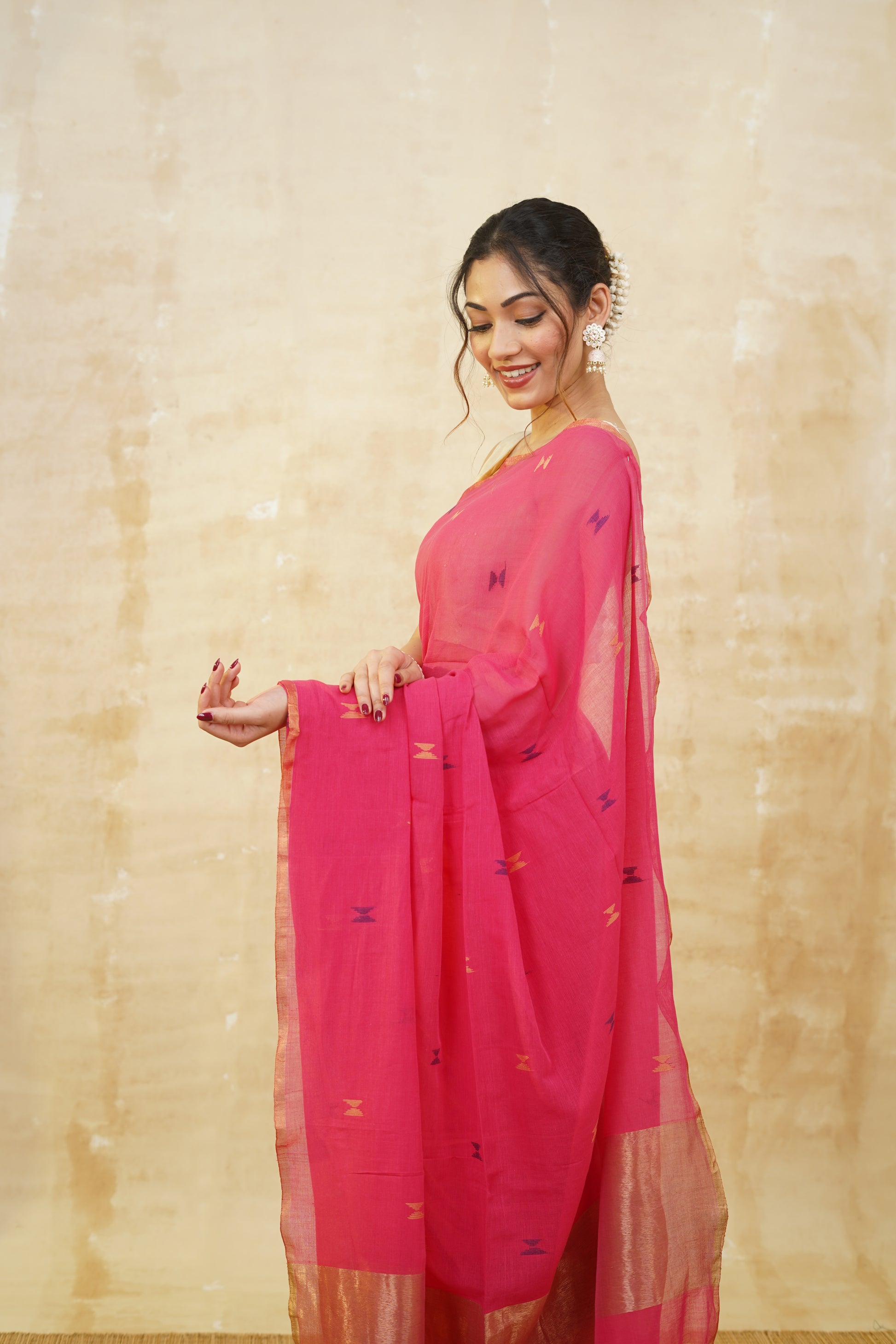 Crafted from 100% pure cotton, this saree is as comfortable as it is beautiful, offering unmatched softness, breathability, and a lightweight drape that’s perfect for all-day wear. The thoughtful details and delicate weave create a harmonious blend of traditional craftsmanship and modern aesthetics.